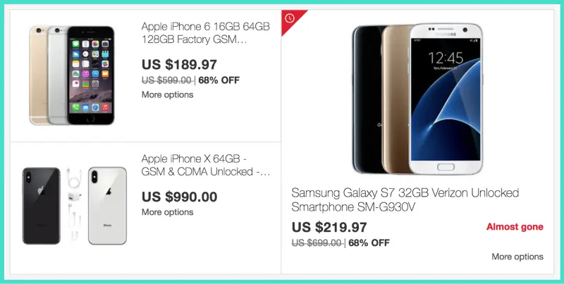 限时产品有红色图标和模糊到“几乎消失”的标签。没有显示优惠结束时间是不合时宜和糟糕的操作。