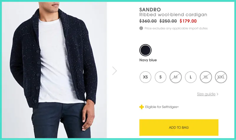 产品的详细信息显示可用和不可用尺寸。这样,它使得可用的感觉更稀缺。这微妙而有用,因为有些人的尺寸需求介于给定尺寸之间。