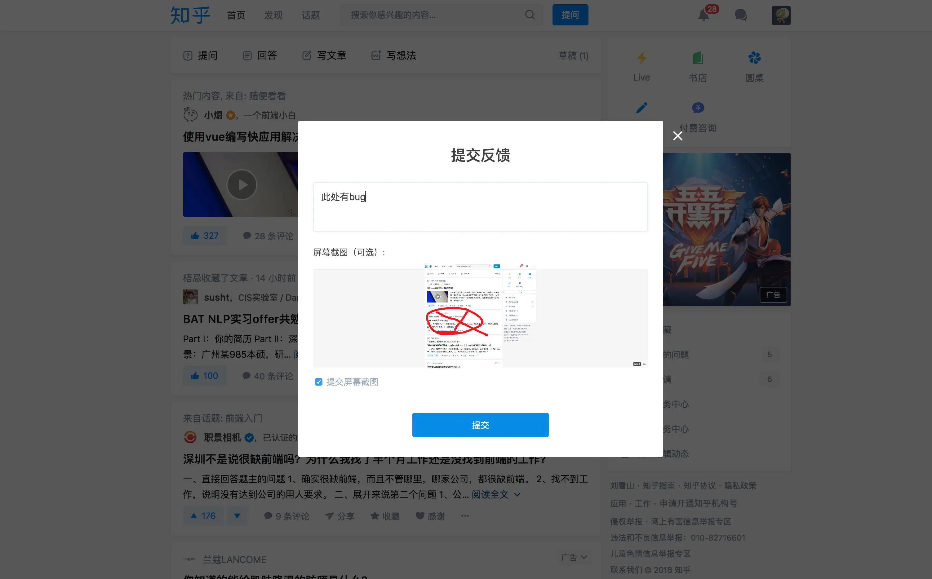 我们看下面的截图,主要是点击反馈,弹出一个模态框,然后这个模态框,会针对当前的屏幕进行截图,然后我们同时可以针对截图的图片,进行标注,比如圈起来有bug的地方。如下图: