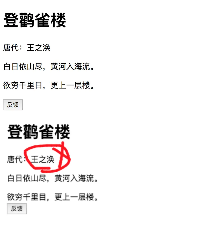 上图中,比如我们发现这个唐诗的作者不对,那我们可以给系统管理员进行反馈拉。