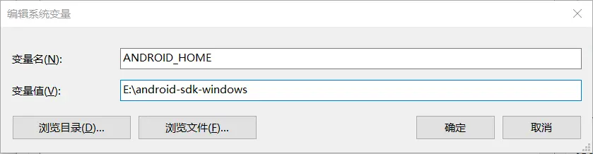 在系统变量里面新建一个ANDROID_HOME变量,在变量值里面输入AndroidSDK的安装路径。