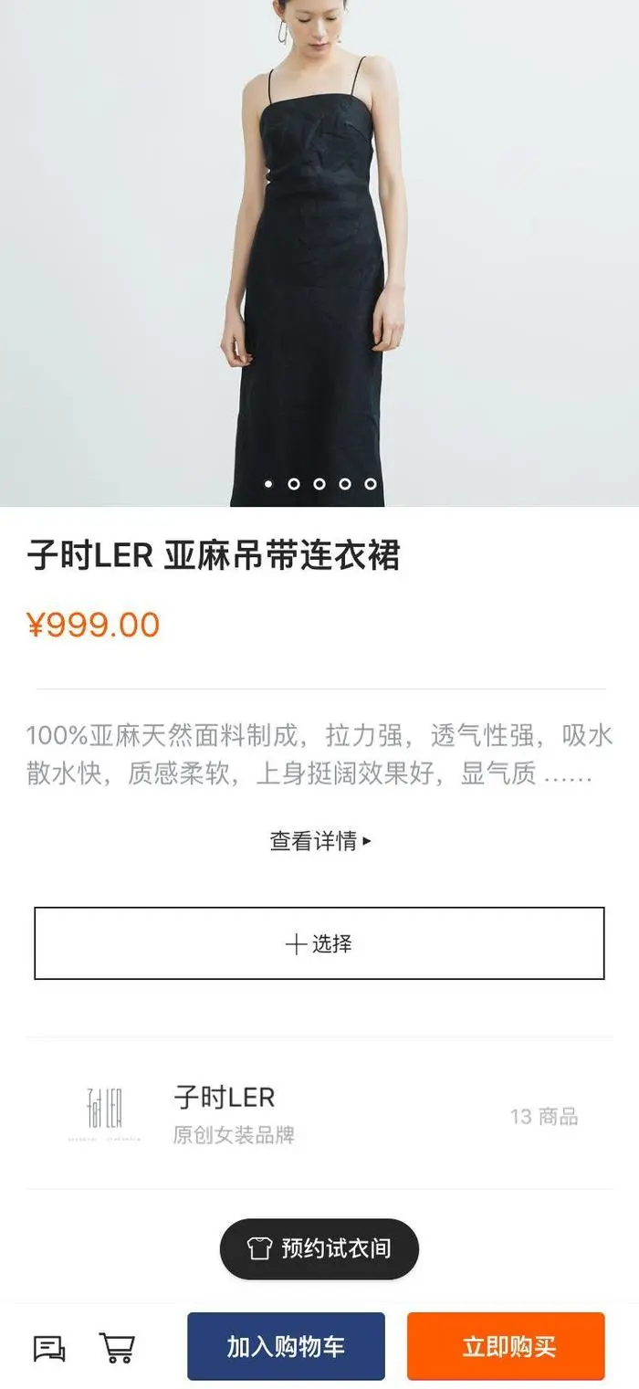 商品详情页主要体现商品的标题、价格、简介,并能快速选择SKU。如果是服装类商品,则会多出“预约试衣间”的按钮。