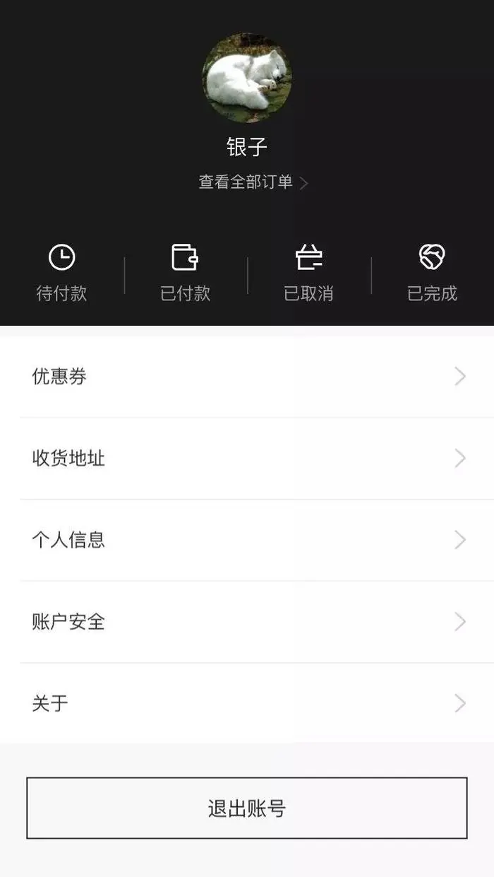 个人中心里有各个订单状态的快捷入口,以及优惠券、收货地址、个人信息、账户安全、关于等。