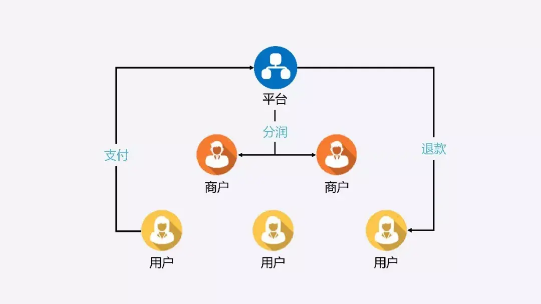 上图是一个很典型的平台商业模式。在这个平台商业模式中有三个主要的角色,用户、商户和平台。当用户在平台上发起交易的时候,需要向平台进行支付。如果用户觉得平台服务不到位,可以申请退款。而在平台商业模式中,一般是由底下的店铺来提供服务的,所以平台很有可能向商户进行分润。