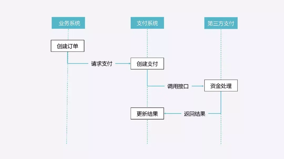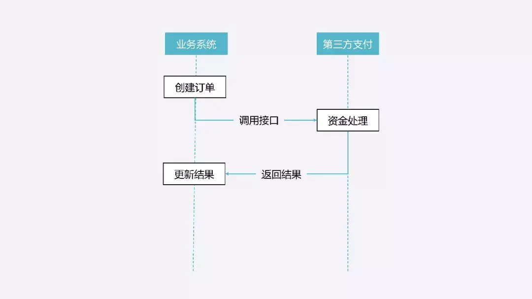 由业务系统生成一笔订单,然后向第三方支付公司发起一笔调用,它进行资金处理并返回结果,我们在业务系统里更新结果就可以了。
