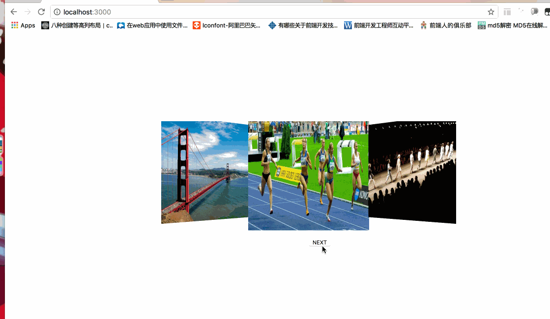 以下一页事件(next) 为例,我们只需要把图片组中,第一张图片移至最后就可以了。这里有一点遗憾的是,没实现state变化 自动render的部分,不过这里主要是讲react的动画思路。
