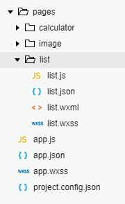 - 首先来说说项目构成,一个page文件夹,里面有单独的文件,然后就是js文件,json文件和配置文件,配置文件也就是最后一个,这个里面的内容不需要我们过多关注,看看就好,在根目录下每个文件中必须包含一个js文件,和一个wxml文件,如果需要样式,那就需要有wxss文件,如下图