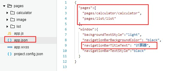 - 在app.json 中是需要我们自己去配置的,如下图,在pags中是我们文件的目录,这个一定要配置好,window中的 navigationBarTitleText 是我们项目的主标题,随意写,想叫什么就写什么