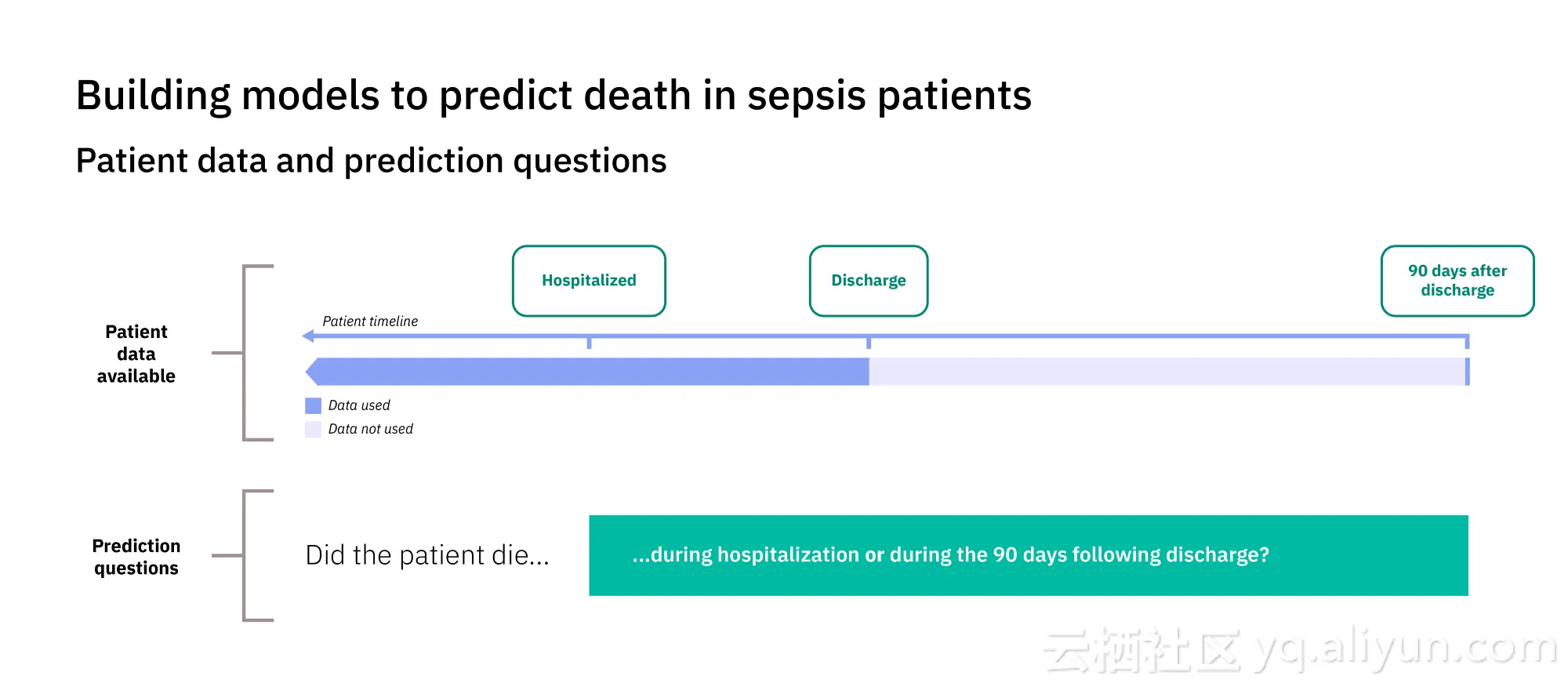 了解脓毒症患者的最高死亡风险对临床医生的优先护理是有帮助的。团队与Geisinger健康护理系统的研究人员合作,使用历史电子健康记录数据(EHR)建立模型来预测脓毒症住院患者在住院期间或出院后90天的全因死亡率(all-cause mortality)。该模型可以指导医疗团队为那些预测为高概率死亡的患者进行仔细监测,并采取有效预防措施。