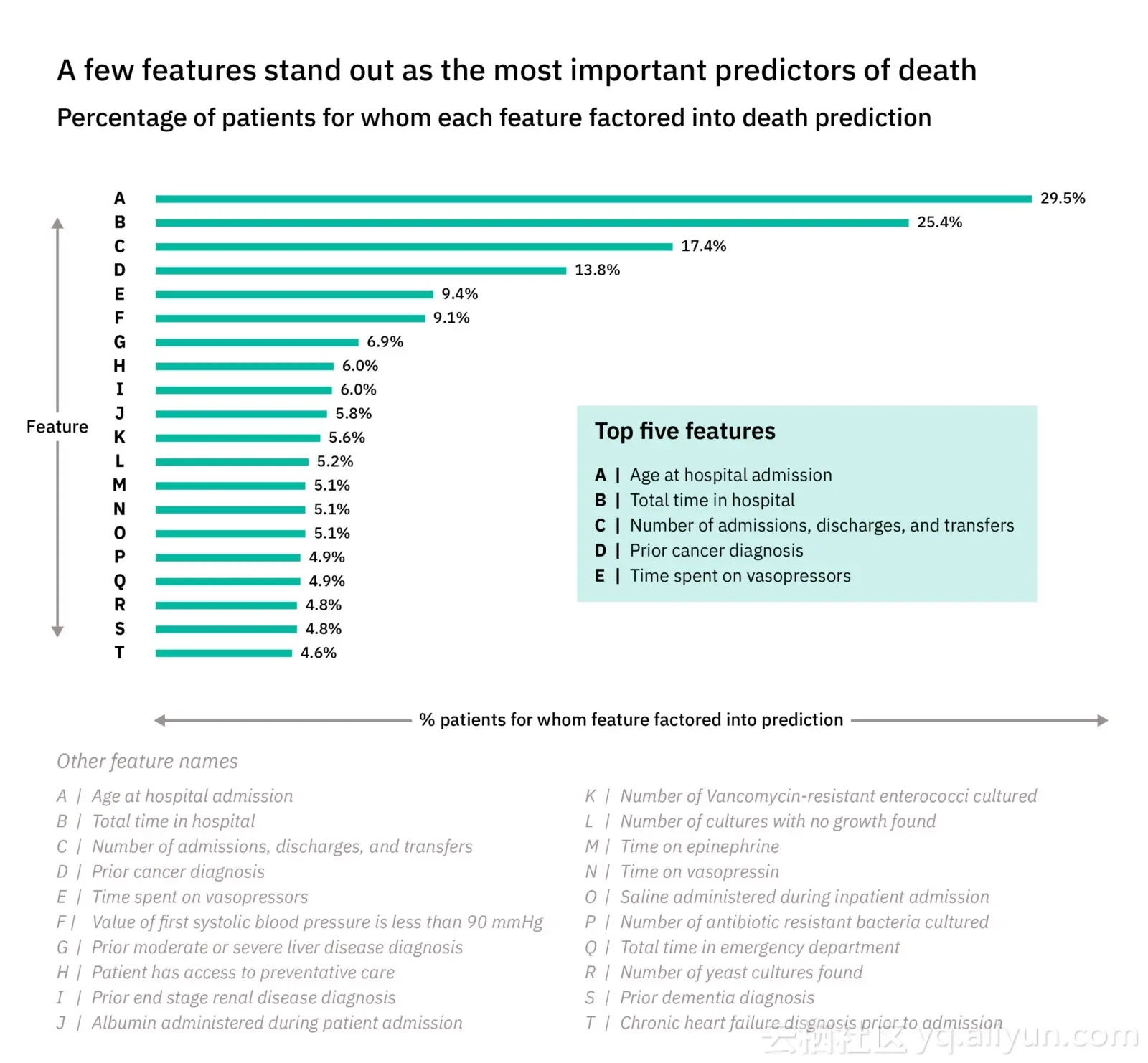 如图5所示,诸如“入院年龄”的特征可能表明老年患者相较于年轻患者而言具有更高的死亡比例,另一个例子“血管升压药使用时间”特征可能表明服用升压药的患者死亡率较高,但这些死亡也可能是由于其不好的健康状况导致。