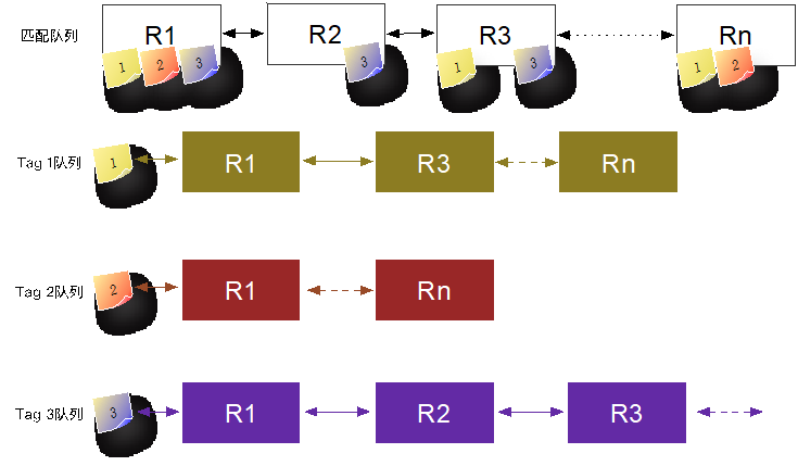 R1: [T1,T2,T3],R2:[T3],R3:[T1,T3],Rn:[T1,T2],这些房间不仅会存在与全局匹配列表中,同时还会存在每个标签索引中。