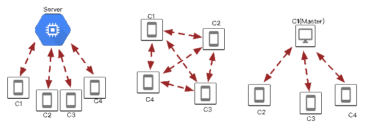 在《网络接入篇》中介绍过网游三种常见的网络架构:C/S架构,P2P架构,还有一种C/M架构,分别如下图所示。