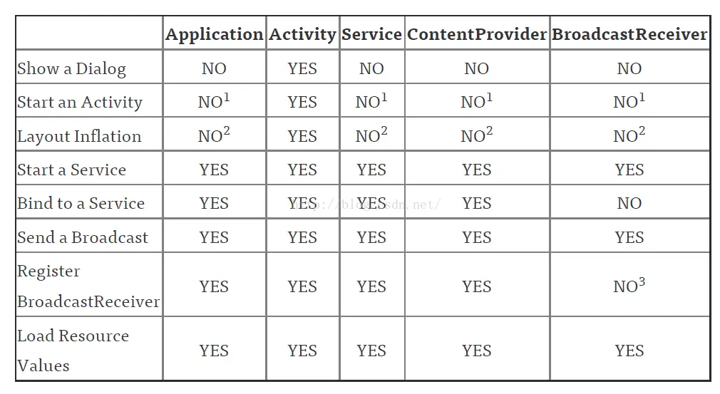 注:ContentProvider、BroadcastReceiver之所以在上述表格中,是因为在其内部方法中都有一个context用于使用。