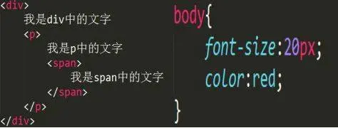 注:在给body设置了font-size、color属性之后,嵌套在body里面的div、p、span标签也应用了此属性,那么这种情况就是CSS的继承属性传递到了子元素以及孙元素身上。这就是css继承机制。