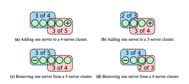 分布式系统的一个非常头疼的问题就是同样的动作发生的时间却不一样。比如上图的集群从3个变成5个,集群的配置从OldConfig变成NewConfig,这些节点配置转变的时间并不完全一样,存在一定的偏差,于是就形成了新旧配置的叠加态。