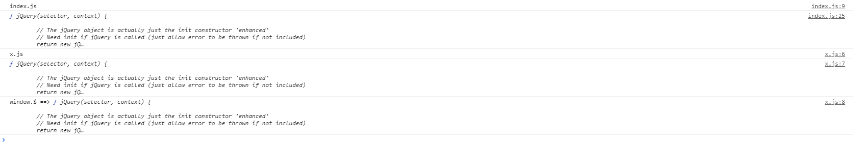 从构建的日志中可以看出,index.js构建后的文件大小和x.js构建的文件大小不一致 从浏览器打印日志可以看出,x.js在没有直接import jquery时,也可以拿到jquery对象