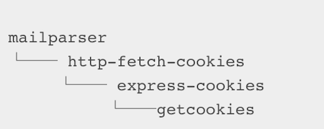 初始报告来自社区的最初报告显示,该软件包 getcookies 潜藏后门程序,而 express-cookies 和 http-fetch-cookies 依赖于 getcookies,而 mailparser 依赖于 http-fetch-cookies。