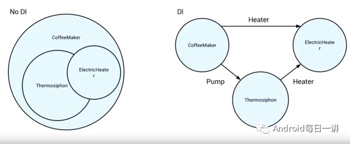 什么是依赖?我的理解,依赖是一个对象的存在需要依附另外一个对象,或者说一个对象需要另外一个对象。我们先在不使用DI的情况下描述一个具体事例,然后再用DI改造我们的代码。举个例子,我们有个咖啡机(这个例子很多介绍Dagger2的地方都用到),就像在星巴克看到的那样,一个咖啡机需要一个泵和一个加热器才能工作