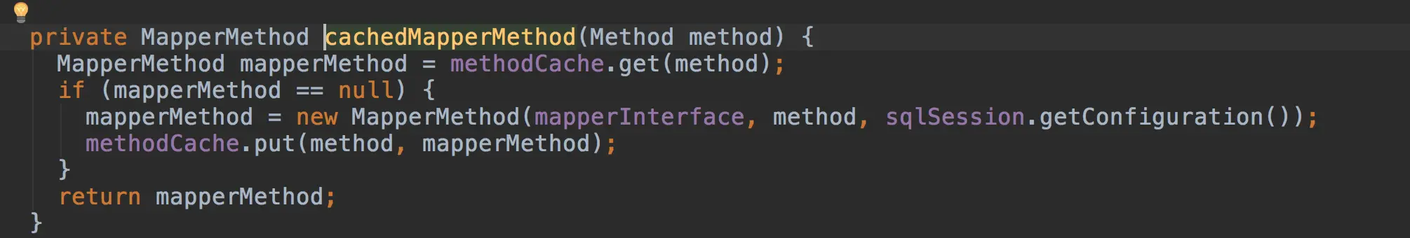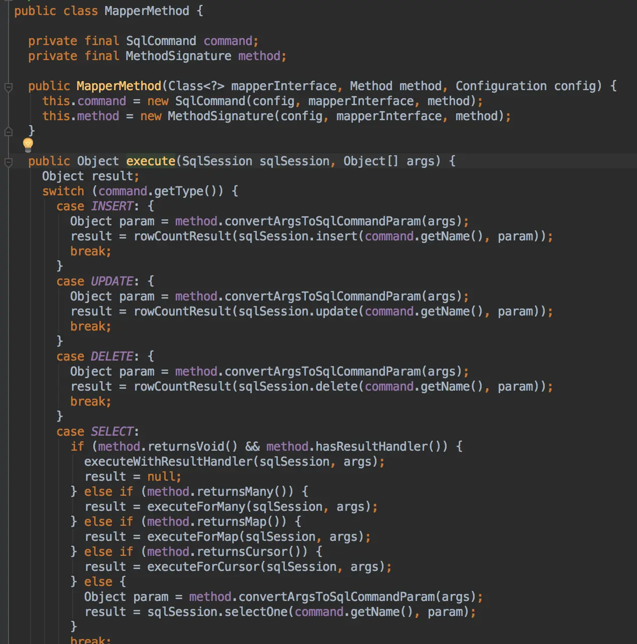 可以看到的是调用执行前创建一个MapperMethod这个对象。然后调用cacehMapperMethod方法先缓存这个mapperCache这个map缓存中去,然后返回的MapperMethod, 最后执行它的execute方法。