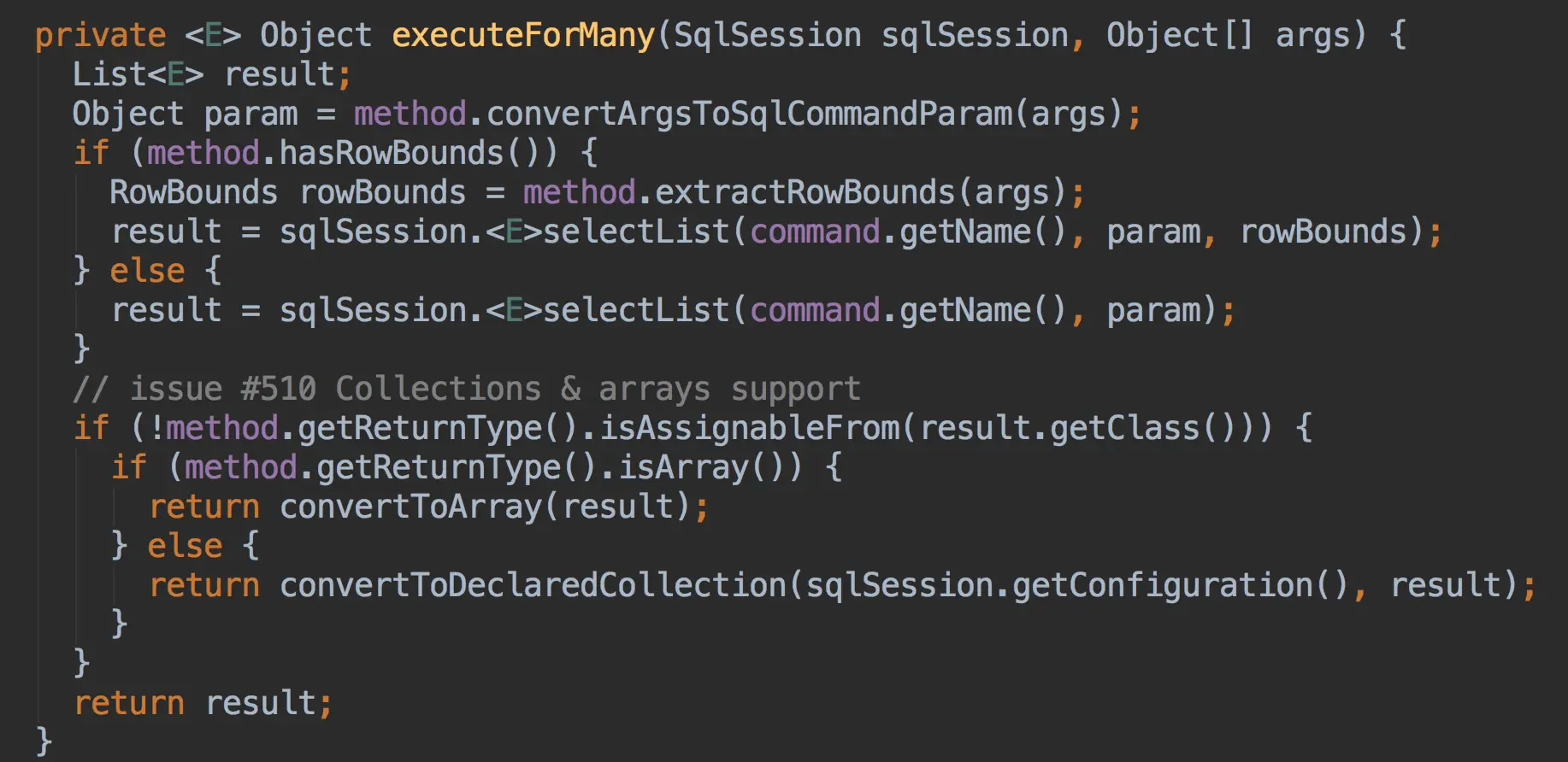 这里选取SELECT且返回多个对象类别为例,进行一次数据的查询过程调用的过程的分析。所以它会执行method.returnMany()这个分支,调用executeForMany这个方法,