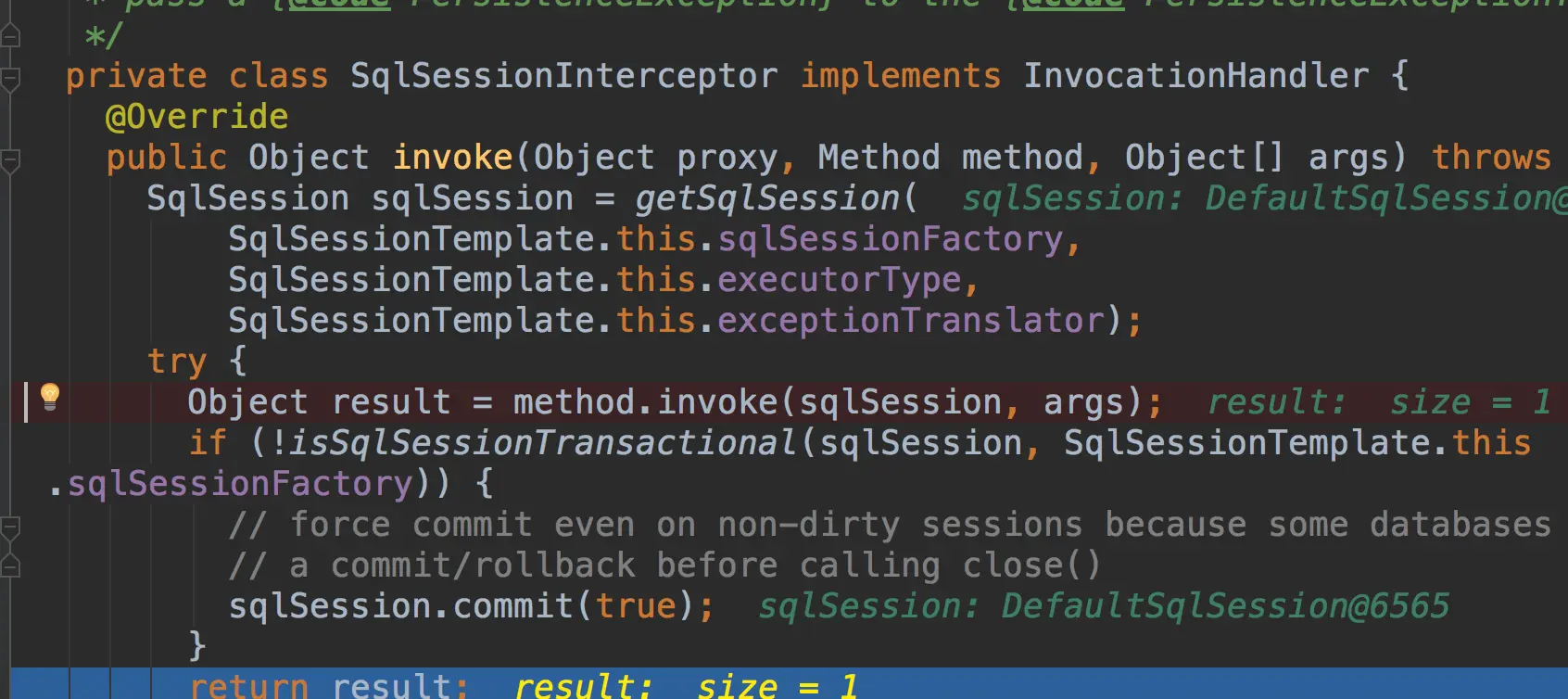 接下来执行拦截器插件,回调下面这段代码它的SqlSessionIntercceptor的invoke方法,
