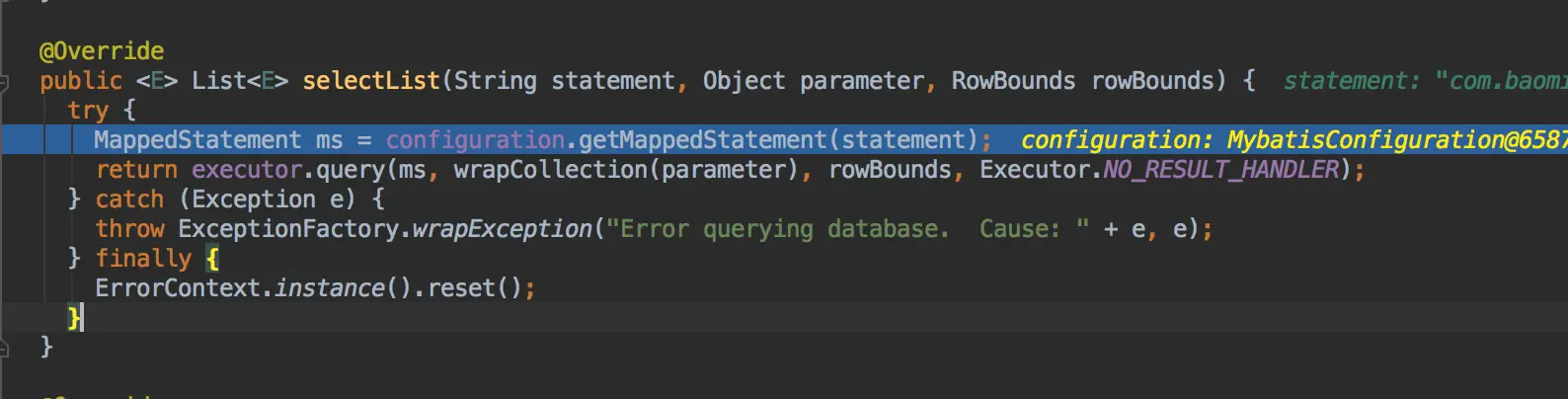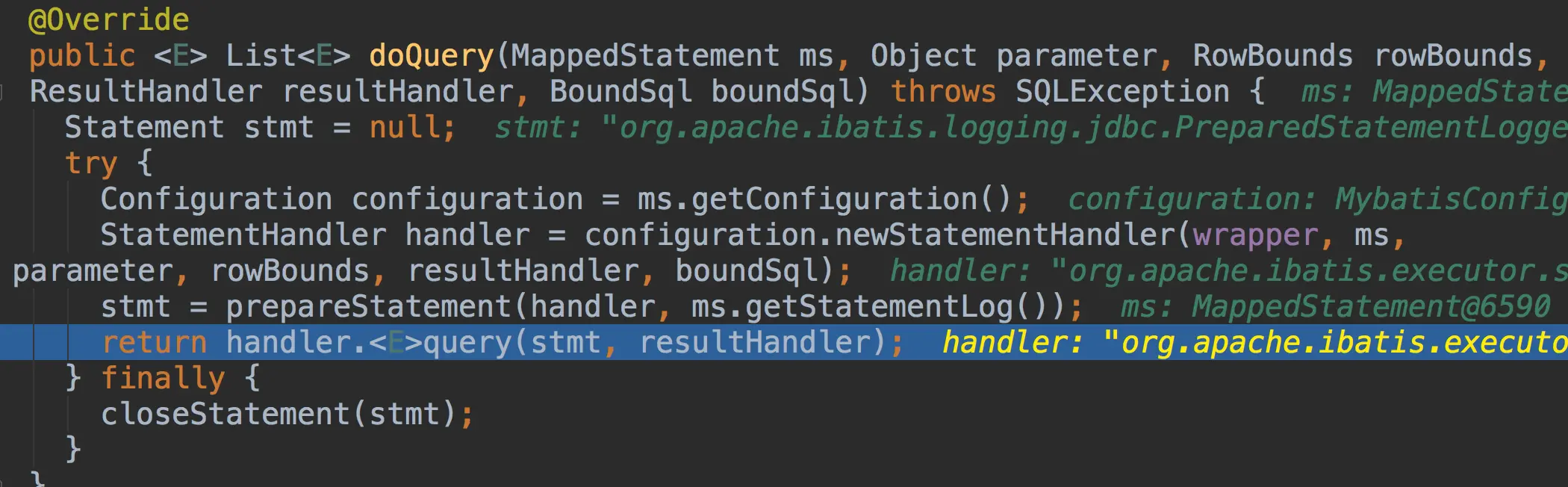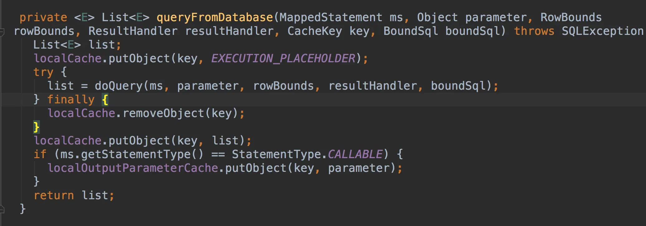 这样做主要是避免并发操作数据库的时候,都去访问数据库。doQuery查询完成后就去将数据缓存到这个localCache中,最后一句是缓存存储过程的输出参数的。暂时可以忽略,这里暂时分析sql的执行。