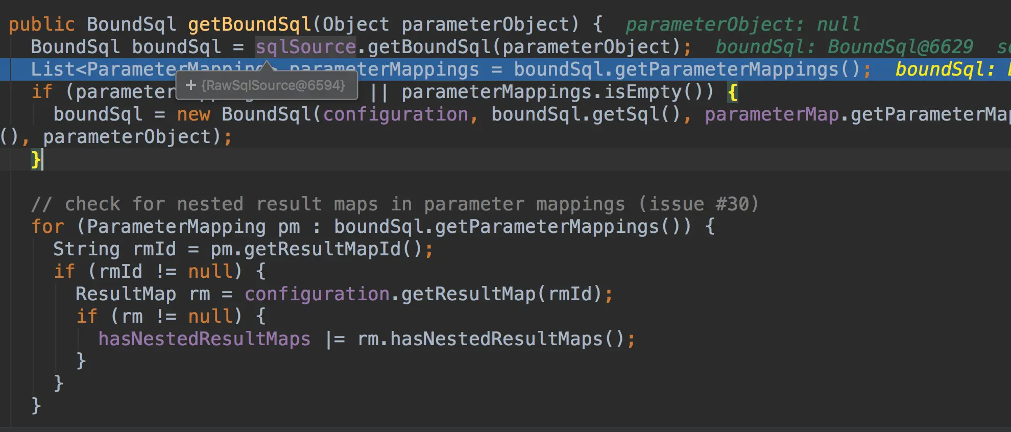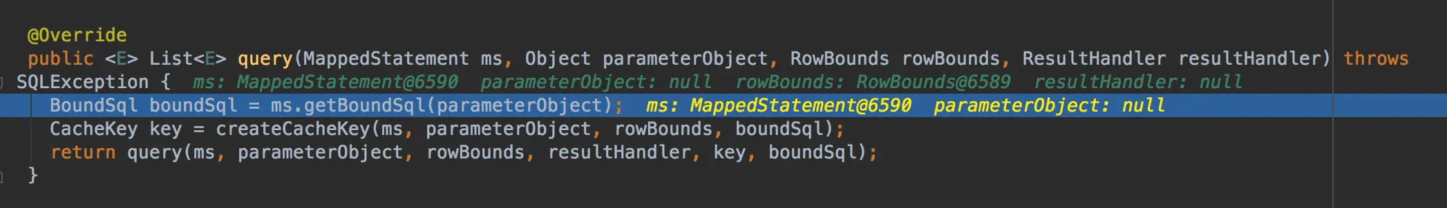 可以看出BoundSql是由sqlSource这个类,实际传入的对象RawSqlSource这个类的实例,然后获取参数映射,然后回到query方法继续执行,创建缓存的key,下面来创建缓存的key。