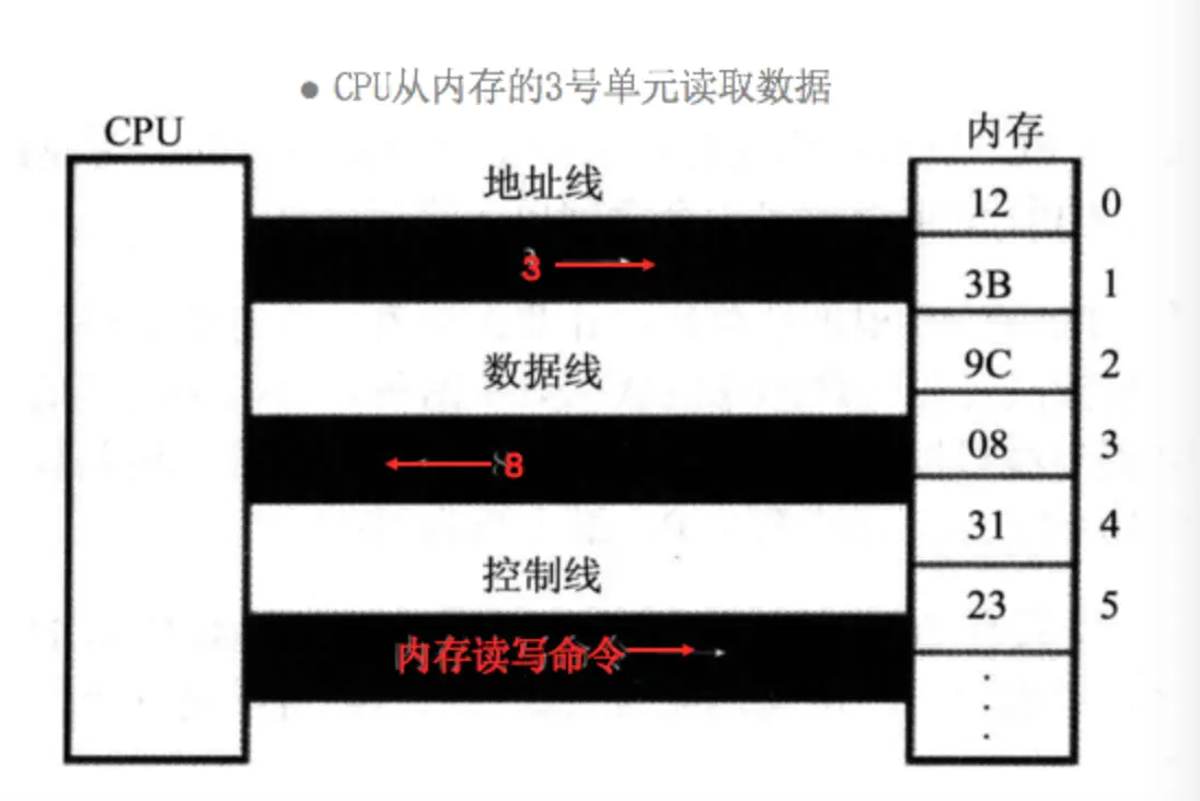 cpu根据地址总线找到内存3,然后用控制总线控制数据总线读写3的数据
