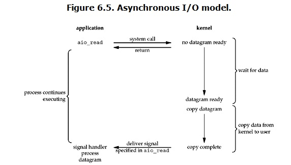 进程是被block的。而asynchronous IO则不一样,当进程发起IO 操作之后,就直接返回再也不理睬了,直到kernel发送一个信号,告诉进程说IO