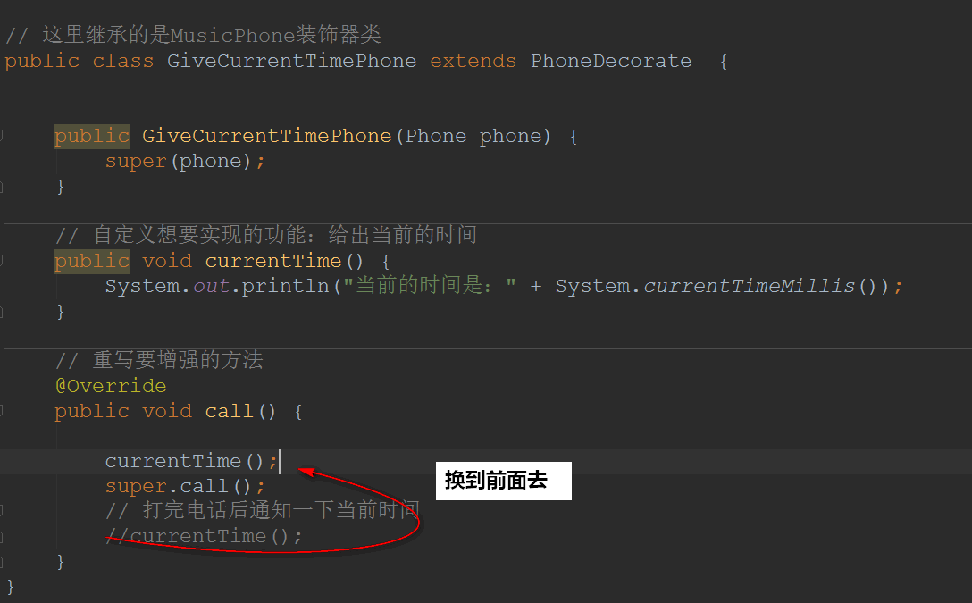 - 此时,我又突然想实现多一个需求了,我想要听完电话之后告诉我一下当前的时间是多少。没事,我们又继承来增强一下: