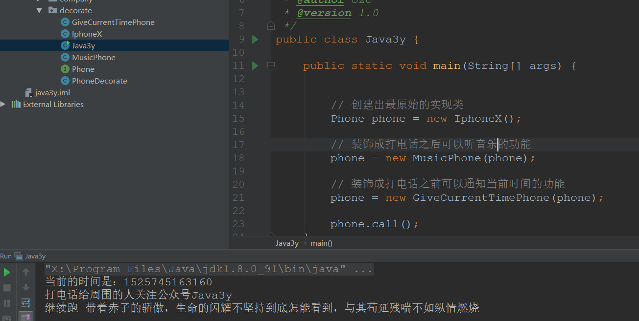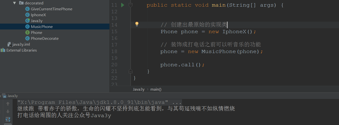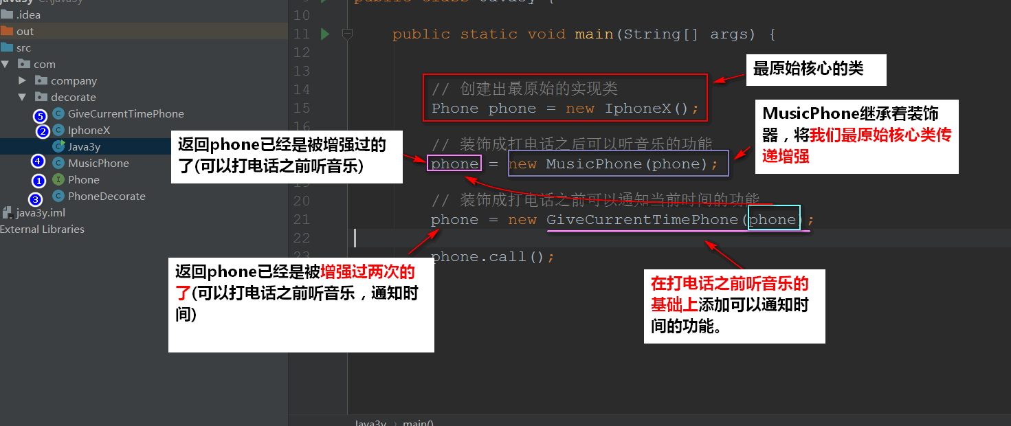 - 第四步:想要扩展什么功能,就继承PhoneDecorate装饰器抽象类,将想要增强的对象(最简单的实现类iPhoneX或者已经被增强过的对象)传进去,完成我们的扩展!