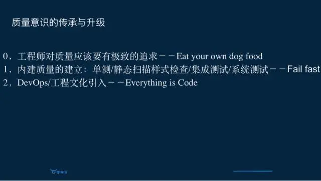 - 内建质量的建立。内建质量决定外建质量,在交付之前的所有过程要尽量提前,并提升内部质量。比如:单测、静态扫描分析、集成测试等等,每一步失败就要去修复。每走一步都要提供验证机制,让代码有办法校验,对整体的质量负责;