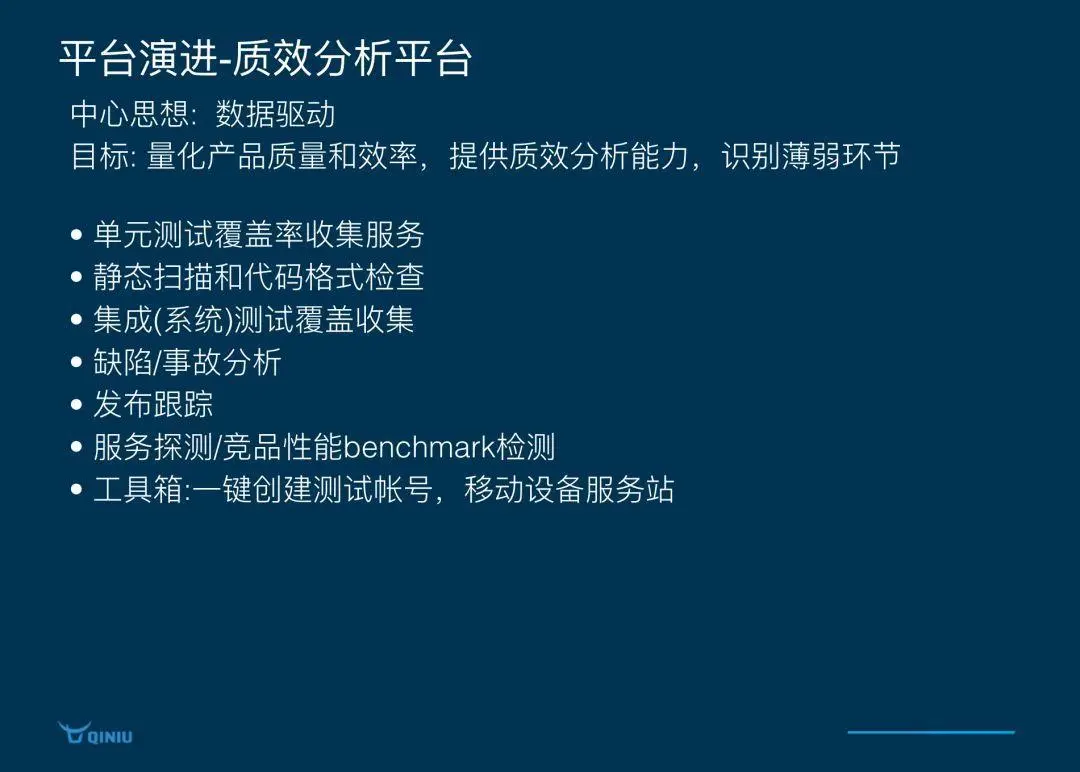 平台演进比较重要,我们需要考虑是否有可能把更多的东西搬上服务。同时,平台化是服务化之后的阶段 —— 如何把服务融入到整个流程中,并且被完整的管理,提供一定的工程能力。我们的目标就是量化产品的质量和效率,提供质效分析能力,识别薄弱环节。