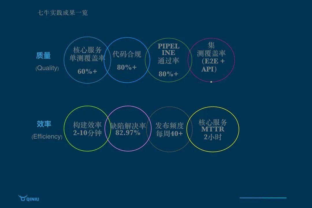 效率方面:pipeline 构建 2 - 10 分钟、缺陷解决率 82%+、发布频度每周 40+、核心服务 MTTR 在 2 小时以内。