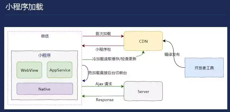 以下是小程序加载的几种简单的示意图,小程序在手机加载时,要在 CDN上面拉一个小程序包,小程序在首次加载时可能有一个等待的时间,当这次安装包缓存到本地以后,下次手机再打开该小程序,则直接从缓存里面读取安装包的内容,如果有新的版本,小程序也不会等新版本更新完了再打开 APP,而是直接用上一层缓存的小程序,等下再启动时,直接使用新的安装包替换旧的。