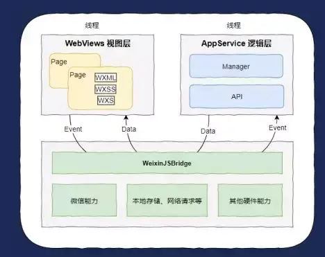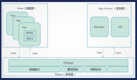 传统的 Web渲染时,如果逻辑里面有很复杂的处理,往往会导致界面出现卡顿的现象。小程序没有这个问题,如果没有调用渲染,不会导致界面的流程度下降。不过,由于视图层和逻辑层在不同的线程里面,这两层不能进行直接的交互,必须通过一些手段实现交互,微信采用 JSBridge实现 JS的运行环境和原生系统的相互调用,当用户在界面上进行操作时候,会触发相关事件,传递到原生 Webviews,再到逻辑层。