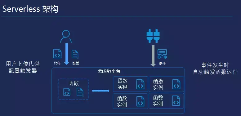因为 Serverless架构是计算托管型的,计算托管意味着把真正的业务代码托管到云上面,然后在云上面运行。Serverless架构的运行方式有一个特点,业务逻辑是触发式运行的。云函数在和各个云产品或云服务打通以后,各个产品或服务产生的事件,都能触发业务逻辑的运行。我们在这里会将云函数与 API网关进行结合,当小程序发出的请求到 API网关时,就会产生一个 API请求事件,然后触发业务代码的运行。用户在进行托管的时候,将代码和触发器的配置提交到云上来,代码内容就是对事件进行逻辑处理。在事件发生和处理的过程中,对于每一次的事件,都有一个代码对应的实例拉起,实际上每个实例都是单独处理一个事件。用户发出请求时服务运行,没有请求时服务不运行。同时本身产品的计费模式也是根据实际服务运行的时间计费的。