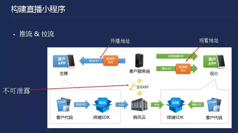 对于一个直播的小程序而言,怎么样才能够用最低成本构建呢?从小程序层面来说,有两点:主播端和观众端,通常主播端需要通过一些组件,完成视频到服务器的推送,进而到观众端。这个过程里,对于小程序开发者来说,核心点包括两个:一个推流,一个拉流。