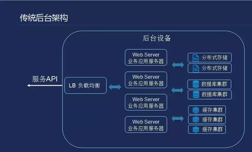 传统的后台架构需要提供 API服务的情况下,首先是需要使用负载均衡,然后接入业务应用服务器,之后接入文件存储、包括结构化和非结构化的数据库服务,以及缓存服务。在这个过程中,为了保证系统不会由于某一个的服务器宕机导致服务瘫痪,需要分别建立业务应用集群、数据库集群、分布式文件存储、缓存集群;建立集群的一个首要作用就是确保不会由于某一个单点故障导致整个服务不可用。下图为传统的后台架构图。
