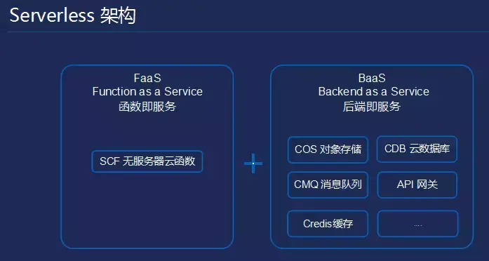 那么,他是如何实现的呢?下图为腾讯云 Serverless架构,可以看成两部分,第一部分就是函数即服务,计算托管在云函数内,真正实现了你业务逻辑的托管计算。另外一种是后端即服务,包括对象存储、消息列队、云数据库、云缓存、API网关等等。