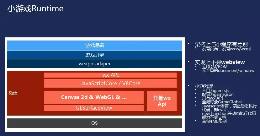 中间层红色部分是微信以及小游戏 Runtime,Runtime对外暴露的能力叫 wx API,有一个基础库的。有一个 jsvm用于执行游戏的 Javascript代码,在安卓上是用 V8Core,iOS则是 JavaScriptCore。再下面一层是核心的渲染能力的实现,包括 Canvas 2d以及 WebGL,当然还有微信开放能力相关 API的实现。