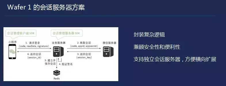 针对 wafer1不足之处,2017年上半年提出 wafer2的解决方案,它是 wafer1是一个简化版,把 wafer1做一些简化合并,兼顾的安全性和便利性,比如说它把会话服务器和业务服务器做一个合并;在 wafer1时代我们会让用户自行部署他的服务器,在这儿我们进行托管式的管理,用户可以购买自己的服务器,但是不需要做服务器端的配置,还会自动免费部署 SSL证书,此外,腾讯云和微信进行深度的合作,已经将 wafer2的解决方案提进微信开发者空间里面去了。