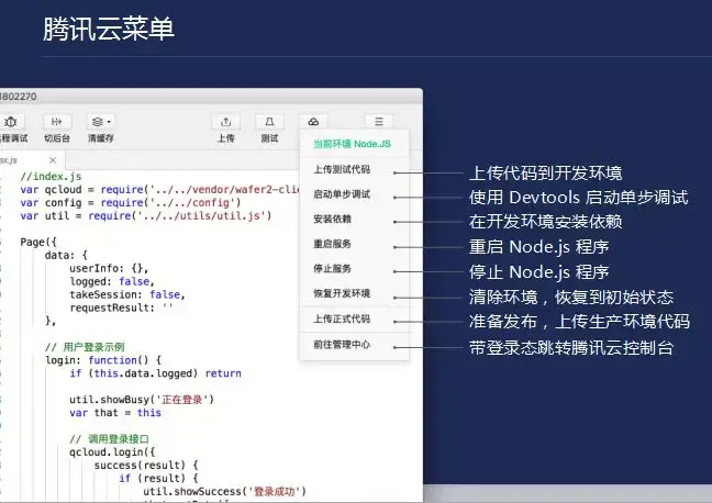 除了 IaaS 能力的解决方案 wafer ,腾讯云还提供了上传代码到开发环境、使用 Devtools 启动单步调试、在开发环境安装依赖、重启 /停止 Node.js 程序、恢复初始状态、上传生产环境代码、带登录态跳转腾讯云控制台等系列解决方案,本文不在此一一赘述,感兴趣的同学可以登录腾讯云官网进行尝试。