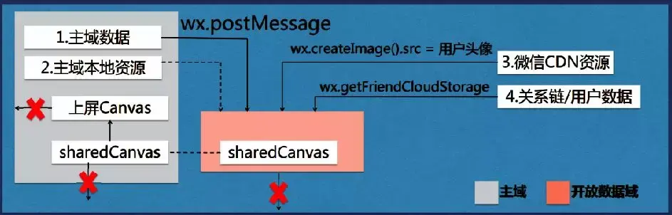 不“出”:不允许开放数据域的数据被上传到第三方服务器去。因为开放数据域里面,index.js是可以直接访问到用户敏感数据的,比如同玩好友数据。当然最终开放数据域需要 index.js在综合各种数据后把数据以图形图像的方式渲染到 sharedCanvas上,在主语 sharedCanvas允许 draw到主域的上屏 Canvas上,最终用户会在显示屏上看到 game.js画出来的好友排行榜、群排行榜或好友超越等社交互动信息。