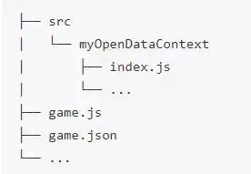 开放数据域是一个封闭、独立的 JavaScript 作用域,和执行游戏逻辑的环境——称为“主域”隔离。其目的是在保证用户隐私的前提下开放用户数据给第三方,提升小游戏的整体用户体验。以下为物理视图,主域的入口为 game.js,开放数据域则是一个独立的目录,其入口文件为 index.js: