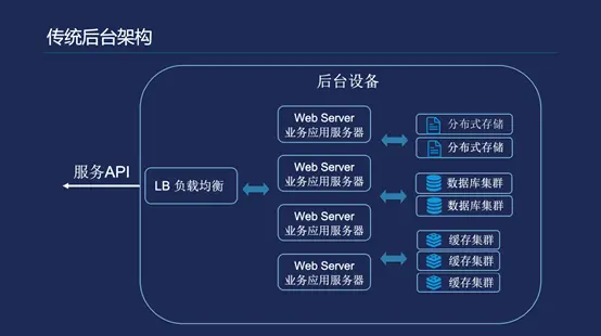 对于后端服务,这张图是大家传统做的方式,暴露api,这些都可以用来开发业务应用,业务应用之后需要有相应的存储文件,结构化的数据存储,或者是非结构化的数据存储,需要有数据库和缓存,为了实现这一套架构且不会由于某一块的服务器宕掉,或者有一些漏洞等等,我们通常的实现是一个较为复杂的过程。比如说,我们为了保证的Serverless和服务器不会垮掉,需要建立一个集群,我们要对外提供服务,需要LB的请求,请求到之后分到某一台服务器上。比如说文件存储,如果单纯只用一台设备,这台设备挂了,整个文件服务就挂了,所以我们要使用分布式存储来解决文件存储的问题。数据库和缓存也是一样的,需要构建集群,无论是两台还是三台还是多台,构建集群以后能确保不会由于某一个单点的问题导致整个服务不可用,从而导致服务瘫痪。