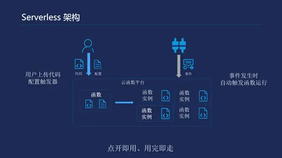 Serverless的计算托管式云在服务函数内,下面来讲一下云函数的架构。大家看到这个架构以后,我们后面在拿一个实际案例来看怎么把具体的api服务落地。云服务器架构本身是计算托管型的,计算托管意味着把真正的业务代码托管到云上面,然后在云上面运行,它的运行方式有一个特点是触发式运营,跟各个产品打通以后,各个产品产生的事件,后面的案例就是和API网关进行结合,从api网关来的事件就是api事件,当这个请求到达api网关时,我们就认为是一个事件,然后再运行。大家最初进行托管的时候,把代码和触发期的配置提交到云上面来,并不是说提交之后代码就运行起来,而是事件到达才运行起来,代码对这个事件进行处理。在这个过程中,对于每一次的事件,每一个代码拉起的过程,实际上都是单独处理一个事件,为什么呢?因为我们在这儿使用并发的模式,如果你有上万个用户同时访问你的小程序,要同时对上万的用户进行服务,启动上万的实例,它是在事件时运行起来,没有事件不能运行,这与微信小程序本身点开即用、用完即走的概念是符合的,有请求时才运行,没有请求时不运行。产品的计费模式也是根据实际运行的时间计费的。