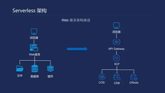 怎么使用Serverless呢?传统的架构就是前面说的web服务,然后是使用存储、缓存,我们对外服务以后,有对外暴露相应的api,实际上用户的业务逻辑都是放在云函数内,需要结构化存储,需要进行缓存或者对象存储,我们需要数据服务或者云缓存服务等,其他的服务都可以直接在线服务,这些服务直接通过代码调用。