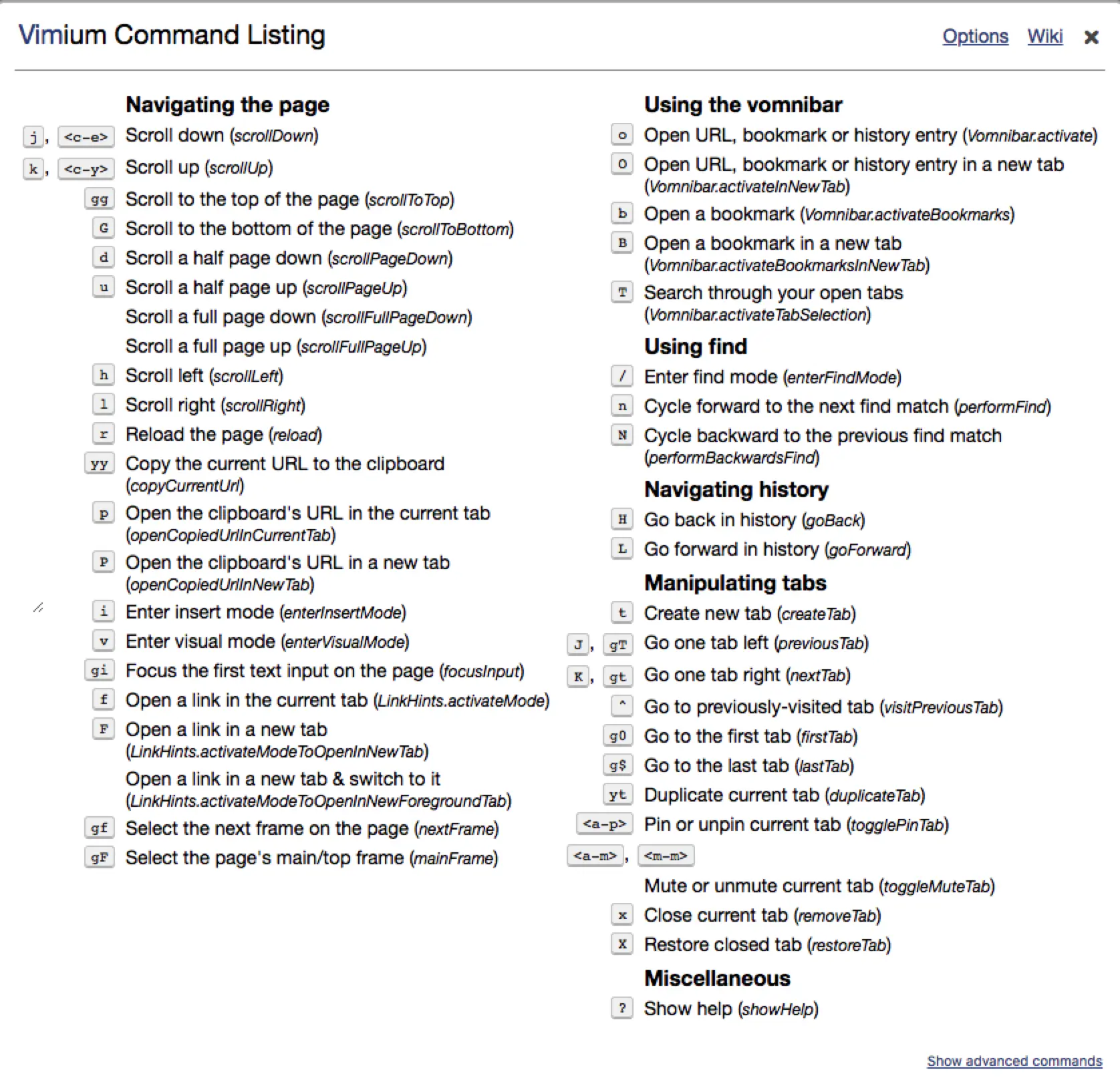 在安装了 vimium 的浏览器中,可以通过快捷键 ? 来查看各个快捷键对应的指令;也可以通过帮助信息 dialog 最上面的 Options 选项来查看指令名称。