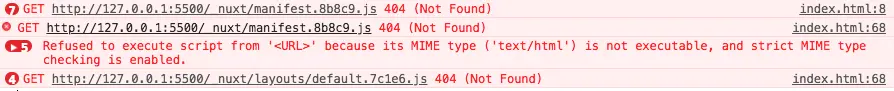 解决方法,设置publicPath,我本地开的服务是(http://127.0.0.1:5500) 所以我在nuxt.config.js中设置如下: 这样通过访问http://127.0.0.1:5500/dist/ 可以访问到我们的首页index.html